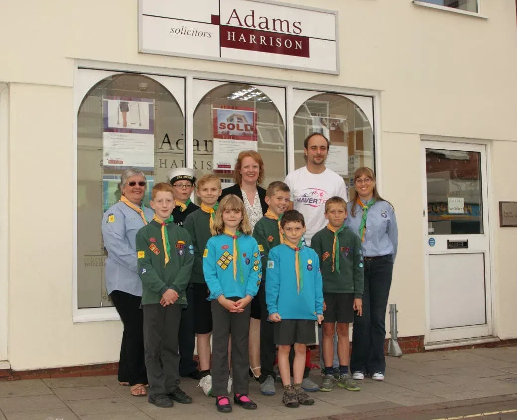 Jenny Carpenter, managing partner of Adams Harrison Solicitors, with HaverSports director Jack Tappin and 2nd Haverhill Sea Scout leaders Monica Reed (left) and Kerry Meek with members of their troop who will among the beneficiaries of HaverTri 2015